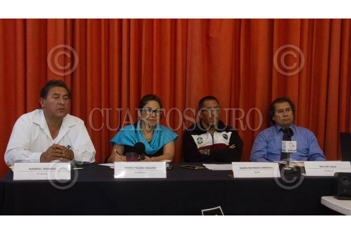 CIUDAD DE MÉXICO, 12SEPTIEMBRE2019.- Gabriel Moreno, María Peláez, Mario Reynoso y Balfer Moreno, durante la conferencia de prensa en donde trataron el tema de de la oposición a la autonomía del Instituto Politécnico Nacional . FOTO: ROGELIO MORALES /CUARTOSCURO.COM