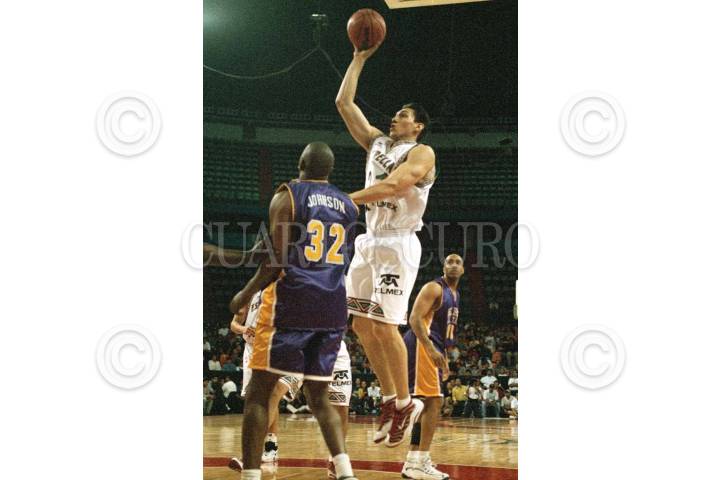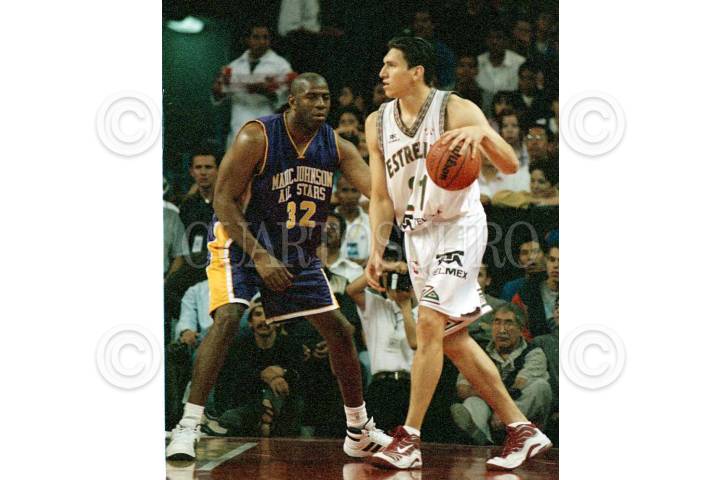 Eduardo Najera y Earving "magic" Johnson durate el partido de exhibicion "Magic Johnson all stars vs. Estrellas de México" en el palacio de los deportes.