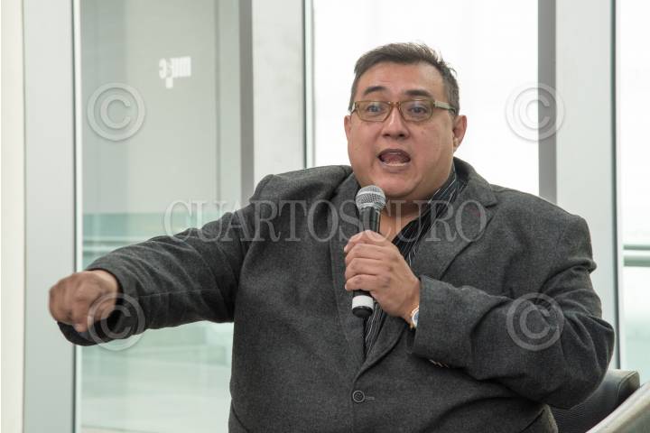 CIUDAD DE MÉXICO, 26ABRIL2017.- Cuauhtémoc Medina, curador de la artista Jill Magid, durante la conferencia de prensa que ofrecieron para hablar sobre la polémica exposición de "Una carta siempre llega a su destino. Los archivos Baragán", en el Museo Universitario de Arte Contemporáneo. FOTO: TERCERO DÍAZ /CUARTOSCURO.COM