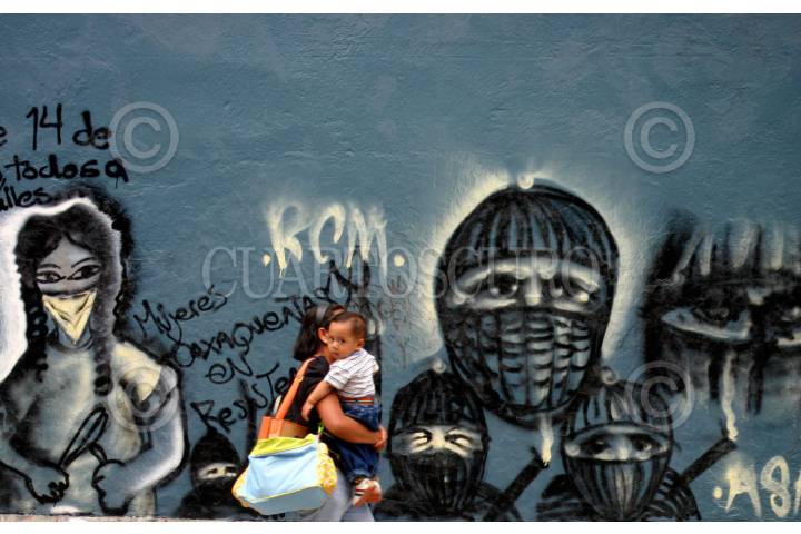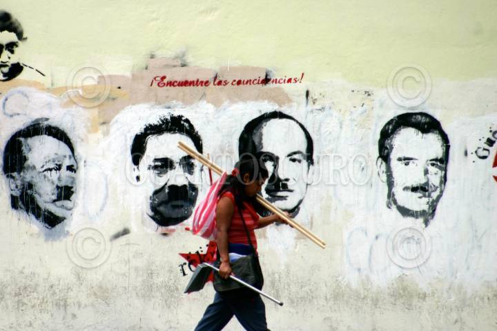 OAXACA, OAXACA, 13JUNIO2008.- Diversas pintas han reaparecido en las paredes de los comercios casas aledañas a el Zócalo, los imagenes muestran imagenes en contra del gobierno federal y local y han sido realizadas supuestamente por los maestros de la sección XXII del Sindicato Nacional de Trabajadores de la Educación que mantienen desde hace un par de semanas un plantón en el centro de la ciudad. FOTO: MAX NÚÑEZ/CUARTOSCURO.COM