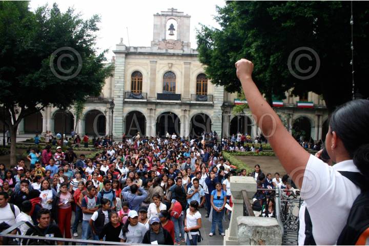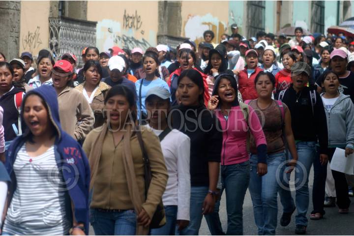 OAXACA, OAXACA 28AGOSTO2008.- Alumnos de las Escuelas Normales de San Pedro Teposcolula y Tamazulapan, realizaron una marcha desde las instalaciones del Centro Regional de Educación Normal de Oaxaca (CRENO), en San Felipe, hacia el zócalo de la ciudad, en demanda de que no se aplique un examen de oposición para poder concursar por una plaza. De acuerdo con la Secretaria de Educación Pública (SEP), todo alumnos egresados de una normal, tiene que realizar un examen de “oposición”, para poder acceder a una plaza frente a grupo, sin embargo los normalistas se niegan a presentarlo. FOTO: MAX NÚÑEZ/CUARTOSCURO.COM