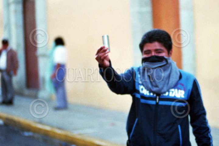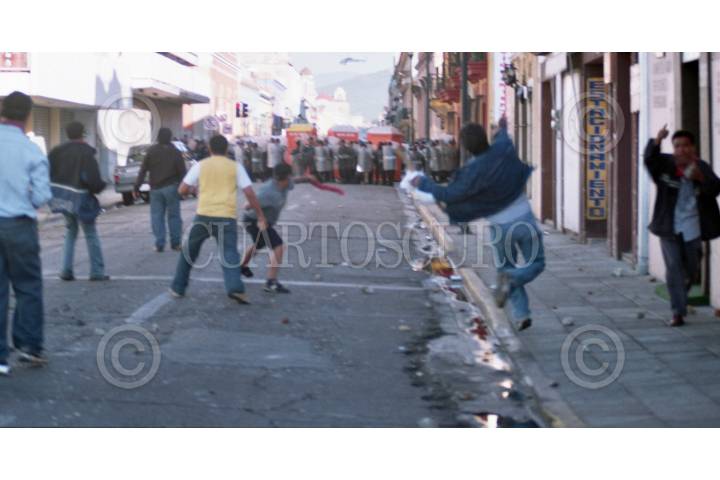 OAXACA, OAXACA, 14JUNIO2006.- Maestros de la Coordinadora Nacional de Trabajadores de la Educación durante el enfrentamiento con policías estatales en el desalojo que intentaron realizar las fuerzas del orden a el plantón que los profesores mantenían en centro de la ciudad. FOTO: Saúl López/CUARTOSCURO.COM