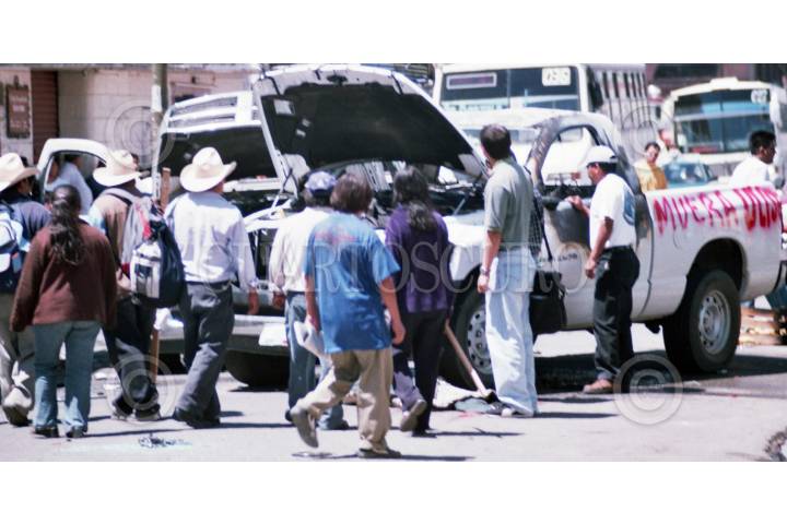 OAXACA, OAXACA, 14JUNIO2006.- Maestros de la Coordinadora Nacional de Trabajadores de la Educación durante el enfrentamiento con policías estatales en el desalojo que intentaron realizar las fuerzas del orden a el plantón que los profesores mantenían en centro de la ciudad. En la imagen algunos vehículos resultaron destruidos durante la trifulca. FOTO: Saúl López/CUARTOSCURO.COM