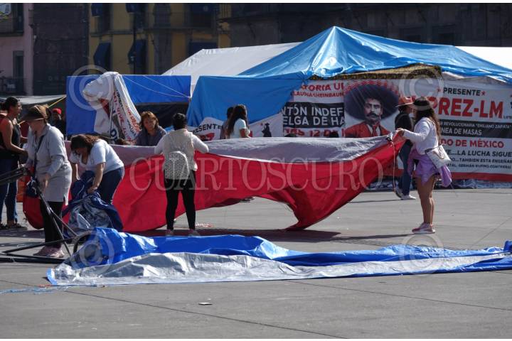 CIUDAD DE MEXICO, 07JUNIO025.- Maestras retiran lonas del plantón que docentes mantenían desde hace 24 días en las inmediaciones del Zócalo capitalino. Declararon que esto simplemente es un acto para reflexionar pero no hay ningún acuerdo con el gobierno federal respecto a las demandas.  FOTO: GALO CAÑAS/CUARTOSCURO.COM