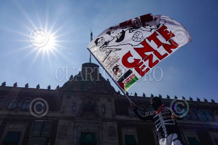 CIUDAD DE MEXICO, 07JUNIO025.- Un hombre caracterizado con pasamontañas del EZLN ondea una bandera del CNTE previo a la conferencia en la que se anunció que se levanta el plantón que docentes mantenían desde hace 24 días en las inmediaciones del Zócalo capitalino. Declararon que esto simplemente es un acto para reflexionar pero no hay ningún acuerdo con el gobierno federal respecto a las demandas.  FOTO: GALO CAÑAS/CUARTOSCURO.COM