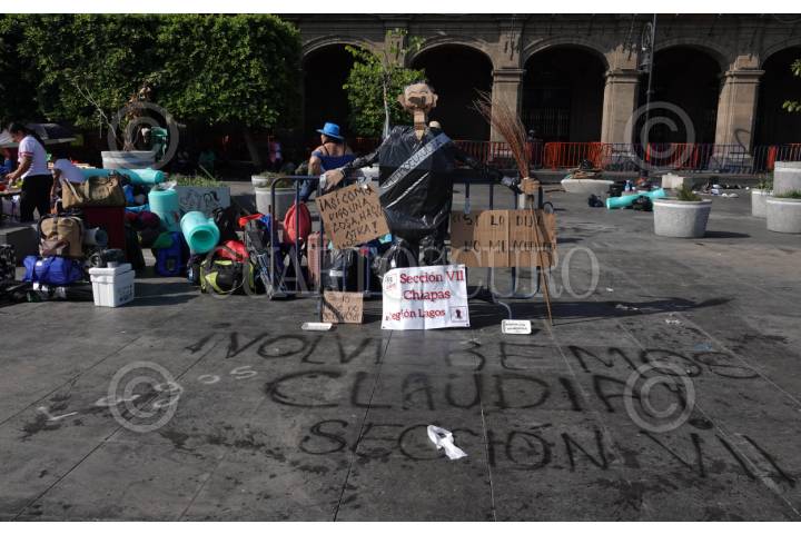 CIUDAD DE MEXICO, 07JUNIO025.- Una pinta con la leyenda "Volveremos Claudia Sección VII" se lee tras la decisión de levantar el plantón que docentes mantenían desde hace 24 días en las inmediaciones del Zócalo capitalino. Declararon que esto simplemente es un acto para reflexionar pero no hay ningún acuerdo con el gobierno federal respecto a las demandas.  FOTO: GALO CAÑAS/CUARTOSCURO.COM