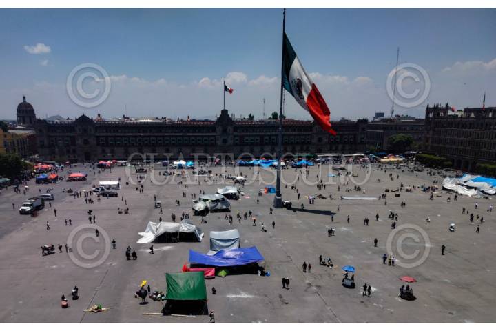 CIUDAD DE MEXICO, 07JUNIO025.- Panorámica de la plancha del Zócalo, la cuál luce casi vacía tras el anuncio de levantar el plantón que docentes mantenían desde hace 24 día. El magisterio declararó que esto simplemente es un acto para reflexionar pero no hay ningún acuerdo con el gobierno federal respecto a las demandas.  FOTO: GALO CAÑAS/CUARTOSCURO.COM