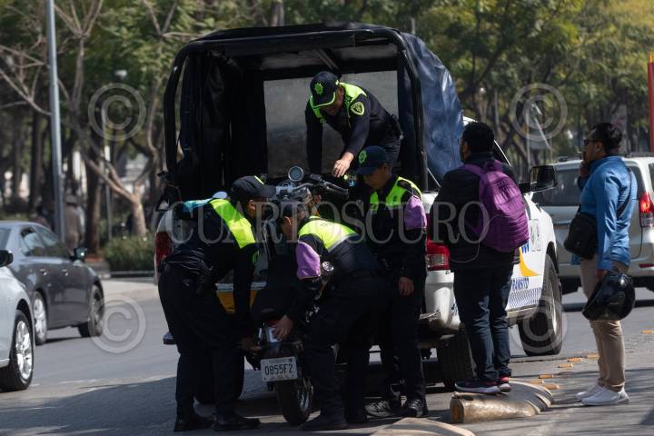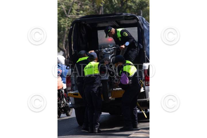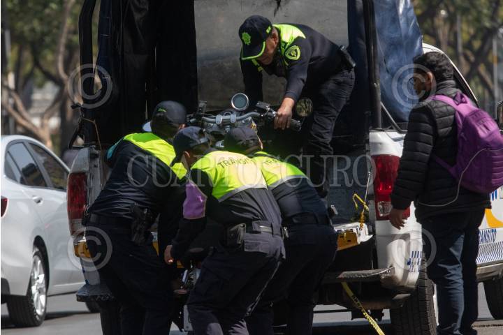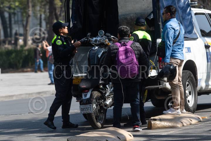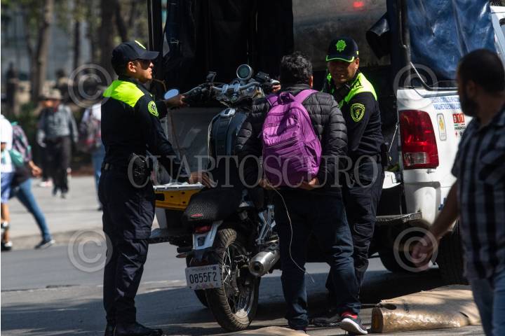 Policías de tránsito de la Secretaría de Seguridad Ciudadana suben a una de sus camionetas una motocicleta mal estacionada en avenida Juárez, ante los reclamos de sus propietarios.