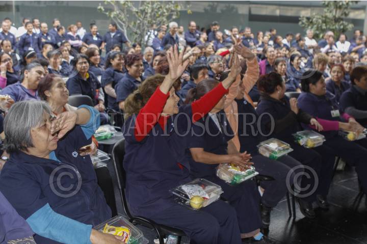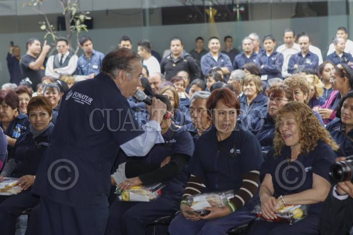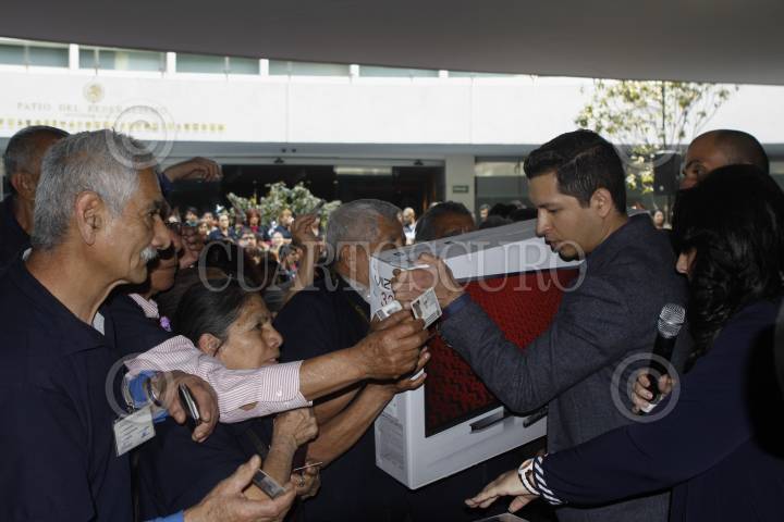 MÉXICO, D.F., 15ENERO2015.- Trabajadores de limpieza del Senado celebraron un convivio el festejo de año nuevo, la senadora Diva Hadamira Gastelum fue la anfitriona del festejo y organizó las dinámicas para que les fueran entregadas lo regalos, una de las cuales provocó un jaloneo entre personas de la tercera edad, por una pantalla plana. FOTO: MOISÉS PABLO /CUARTOSCURO.COM