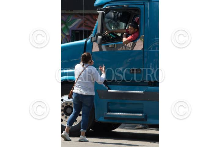 Una enfermera dialoga con un trailero que fue afectado por el bloqueo que realizó personal médico del Hospital de Infectología del IMSS
