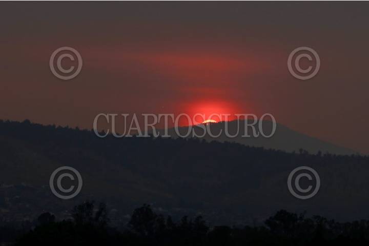 OAXACA DE JUÁREZ, OAXACA, 11MAYO2024.- Derivado del incendio forestal que se mantiene activo desde el martes 7 de mayo en el Valle de Tlacolula y que ha consumido cientos de hectáreas, este sábado se reportó mala calidad del aire en la zona metropolitana de Oaxaca. Debido a esto así se apreció el atardecer desde la capital del estado; los Servicios de Salud de Oaxaca exhortaron a la población vulnerable evitar la exposición al ambiente externo, ya que las condiciones meteorológicas no favorecen la dispersión de contaminantes. FOTO: CAROLINA JIMÉNEZ/CUARTOSCURO.COM