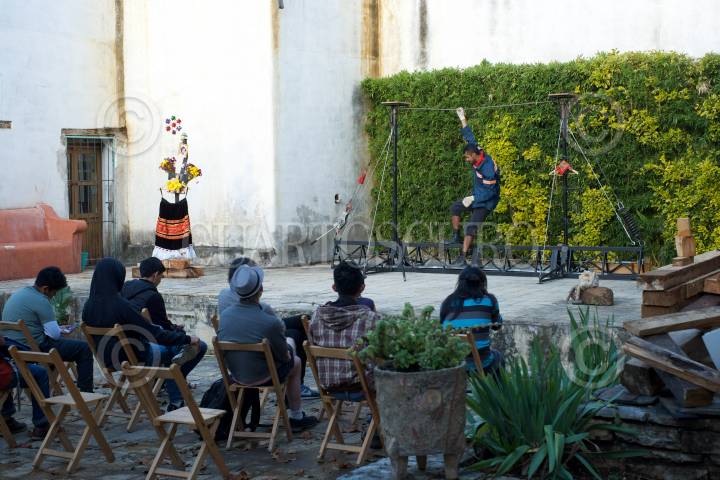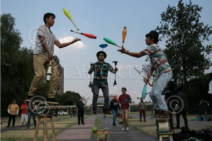 Jóvenes realizan malabares, acrobacia, y ejercico de equilibrio para exhibir la cultura circense en México.