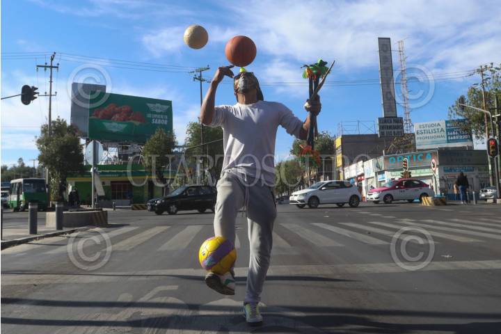 Martín García, realiza malabares en los cruces de Avenida la Paz y Calzada Federalismo, en el centro de la ciudad.