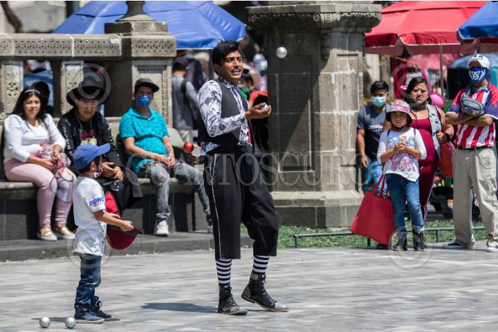 Un joven payaso se gana la vida haciendo malabares en la Alameda Central.