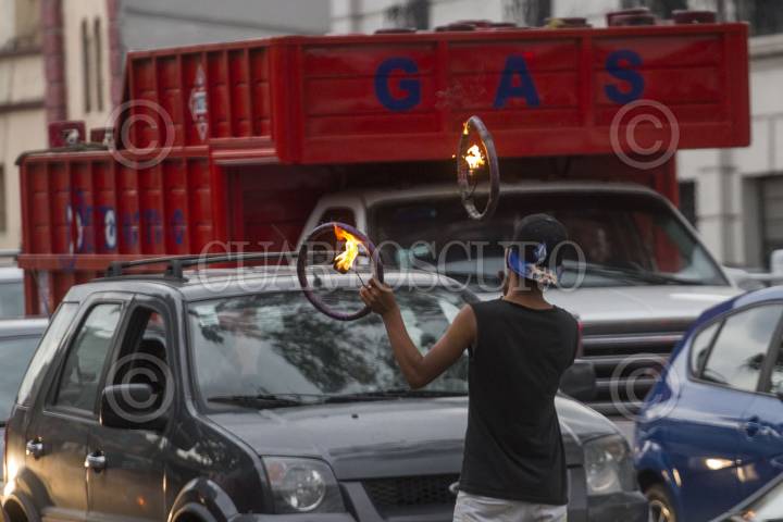 MÉXICO, D.F., 03JUNIO2015.- Un malabarista se gana unas monedas jugando con unos aros de fuego, en un cruce de la Delegación Cuauhtemoc. FOTO: ISAAC ESQUIVEL /CUARTOSCURO.COM