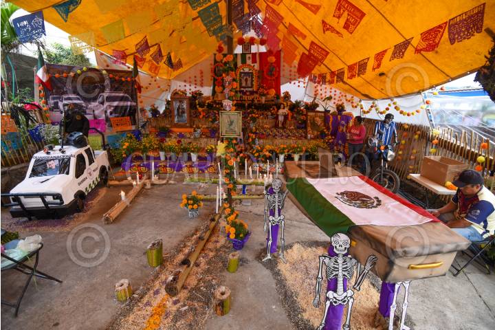 MALINALCO, ESTADO DE MÉXICO, 01NOVIEMBRE2024.- Con ofrendas coloridas y monumentales es como se celebra a los Nuevos Difuntos en Malinalco, los hogares abren sus puertas desde el 28 de octubre hasta el 2 de noviembre a visitantes, en los altares se recrea la vida del fallecido, todos sus gustos y aficiones, en la elaboración las familias llegan a tardarse cerca de 2 meses. Aquellos que visitan las ofrendas llevan una cera o veladora al fallecido lo que representa una luz en su camino y a cambio la familia ofrece dulces, tamales, fruta, pan, ponche, agua o mezcal.FOTO: CRISANTA ESPINOSA AGUILAR /CUARTOSCURO.COM