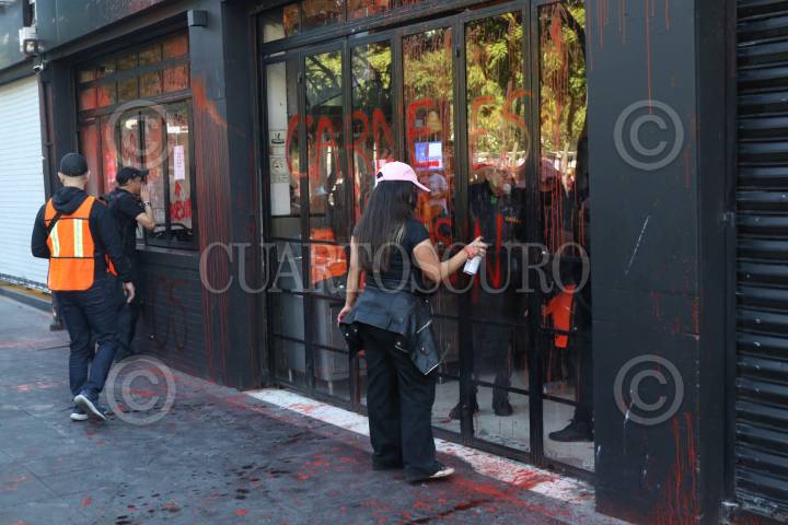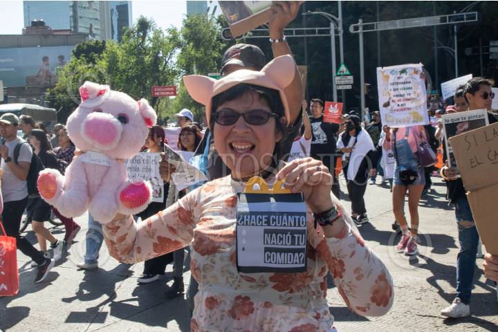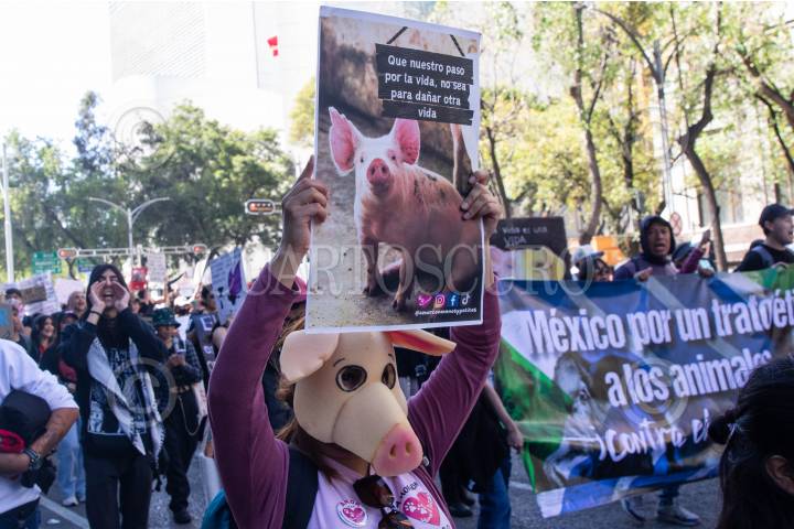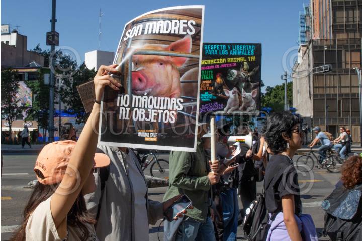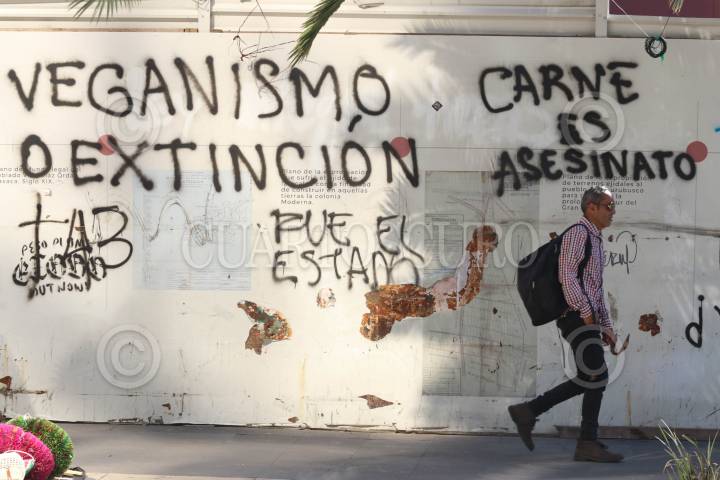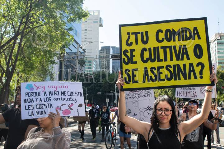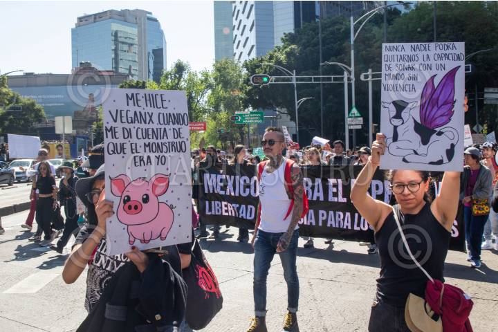 CIUDAD DE MÉXICO, 24NOVIEMBRE2024.- Activistas pro derechos de los animales marcharon por avenida Reforma, durante su paso condenaron que la sociedad coma carne e invitaron a cambiar a una dieta vegada, ya que ellos consideran que cualquier ser animal siente dolor y tiene derechos. También pidieron que se legisle con condenas más severas a los que maltratan a los animales, incluidas las corridas de toros, las cuales hasta poco fueron nuevamente autorizadas en la CDMX. Durante la movilización algunos participantes del contingente pintaron leyenda a favor de veganismo y en contra del consumo de carne, lo que incluyo una taquería, la cual fue vandalizada con pintura roja. FOTO: MOISÉS PABLO/CUARTOSCURO.COM