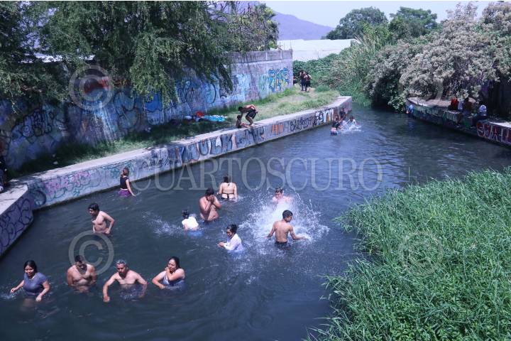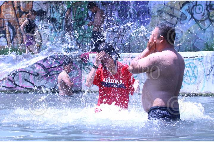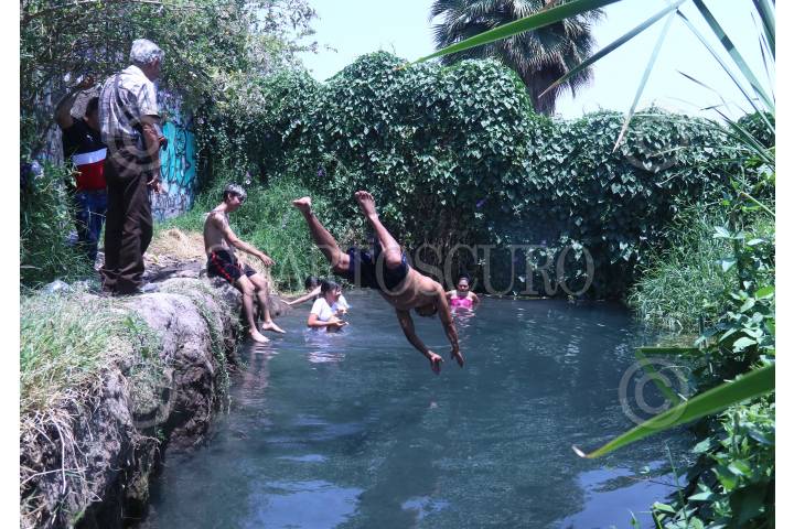 Vecinos de Yautepec se refrescan de las altas temperaturas en las compuertas del manantial El Repartidor.