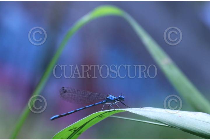 Una libélula azul se posa en una hoja en el manantial El Repartidor en Yautepec, Morelos.