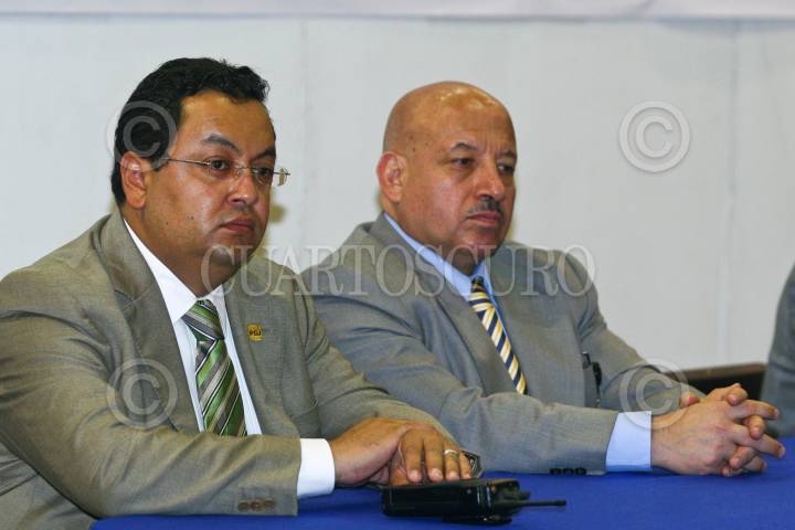 MÉXICO, D.F 20MAYO2008.- Luis Genero Vázquez Rodríguez, director general del Estado Mayor de la Policía Judicial, quien será el coordinador de la UNIPOL, y Miguel Amelio Gómez, jefe general de la Policía Judicial local, durante la presentación de esta nueva policía en la delegación Benito Juárez. FOTO: ISAAC ESQUIVEL/CUARTOSCURO.COM