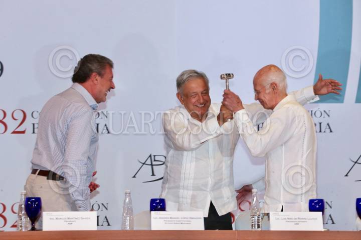ACAPULCO, GUERRERO, 22MARZO2019.- Marcos Martínez Gavica, Presidente de la Asociación de Bancos de México; Andrés Manuel Lopez Obrador, Presidente de México y Luis Niño de Rivera, Presidente entrante de la Asociación de Bancos de México, durante la clausura de la 82 Convención Bancaria. FOTO: CUARTOSCURO.COM