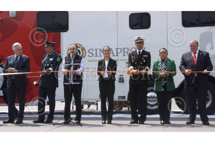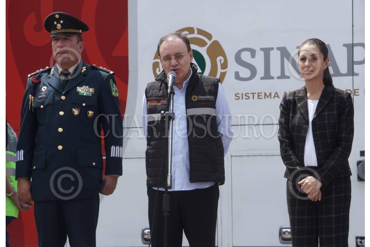 CIUDAD DE MÉXICO, 20SEPTIEMBRE2019.- Alfonso Durazo, Secretario de Seguridad y Protección Ciudadana; Claudia Sheinbaum, Jefa de Gobierno de la Ciudad; Rosa Icela Rodríguez, Secretaria de Gobierno de la Ciudad y Suinaga Cárdenas, presidente de la Cruz Roja, durante la inauguración de la exposición para conmemorar el " Día Nacional de Protección Civil y los sismos de 1985 y 2017", en la Plaza de la Construcción. FOTO: ROGELIO MORALES /CUARTOSCURO.COM