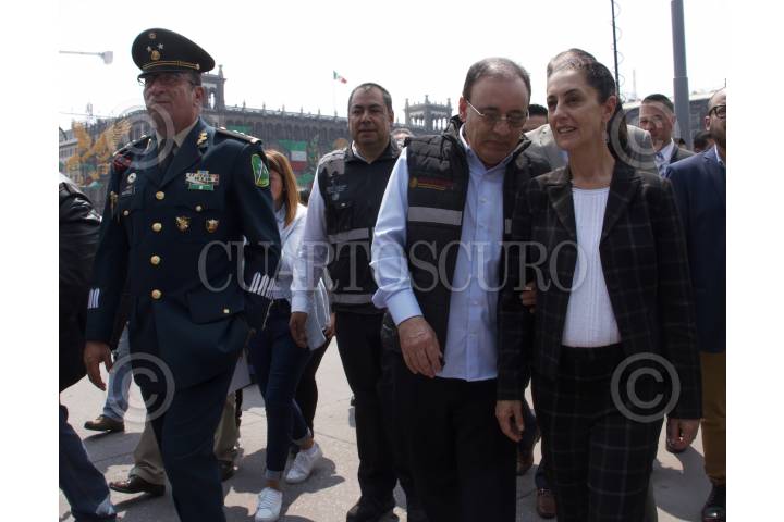 CIUDAD DE MÉXICO, 20SEPTIEMBRE2019.- Claudia Sheinbaum, Jefa de Gobierno de la Ciudad y Alfonso Durazo, Secretario de Seguridad y Protección Ciudadana, durante la inauguración de la exposición para conmemorar el " Día Nacional de Protección Civil y los sismos de 1985 y 2017", en la Plaza de la Construcción. FOTO: ROGELIO MORALES /CUARTOSCURO.COM