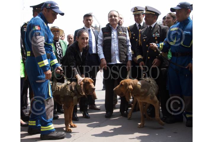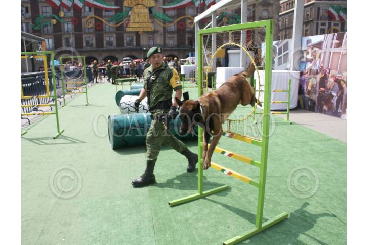 CIUDAD DE MÉXICO, 20SEPTIEMBRE2019.- Soldado con binomio canino, durante la inauguración de la exposición para conmemorar el " Día Nacional de Protección Civil y los sismos de 1985 y 2017", en la Plaza de la Construcción. FOTO: ROGELIO MORALES /CUARTOSCURO.COM