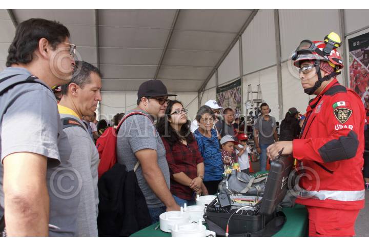 CIUDAD DE MÉXICO, 20SEPTIEMBRE2019.- Público civil, durante la inauguración de la exposición para conmemorar el " Día Nacional de Protección Civil y los sismos de 1985 y 2017", en la Plaza de la Construcción. FOTO: ROGELIO MORALES /CUARTOSCURO.COM