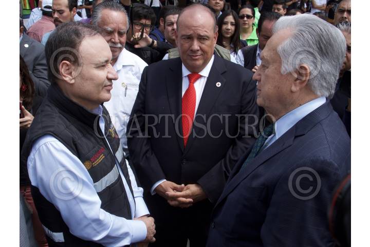 CIUDAD DE MÉXICO, 20SEPTIEMBRE2019.- Alfonso Durazo, Secretario de Seguridad y Protección Ciudadana y Suinaga Cárdenas, presidente de la Cruz Roja, durante la inauguración de la exposición para conmemorar el " Día Nacional de Protección Civil y los sismos de 1985 y 2017", en la Plaza de la Construcción. FOTO: ROGELIO MORALES /CUARTOSCURO.COM
