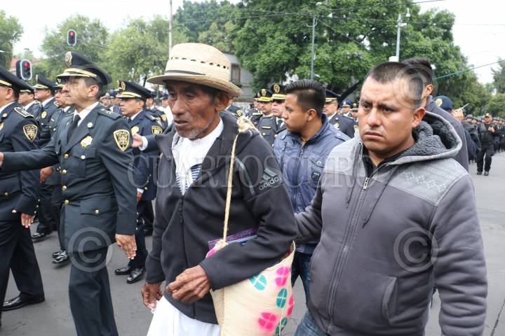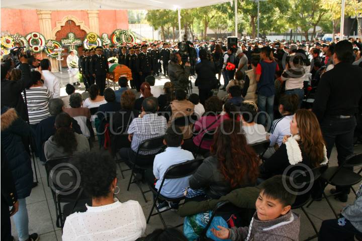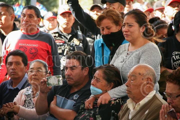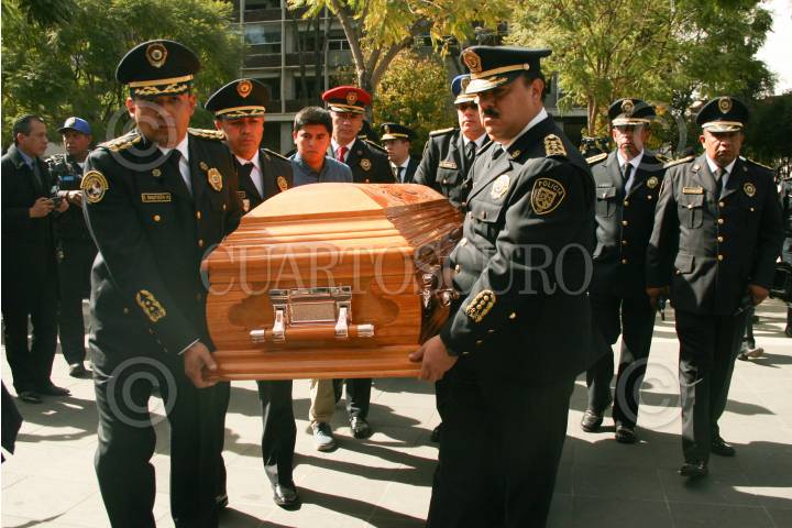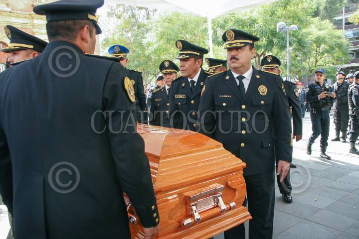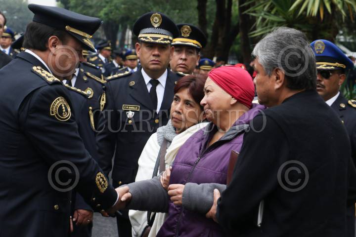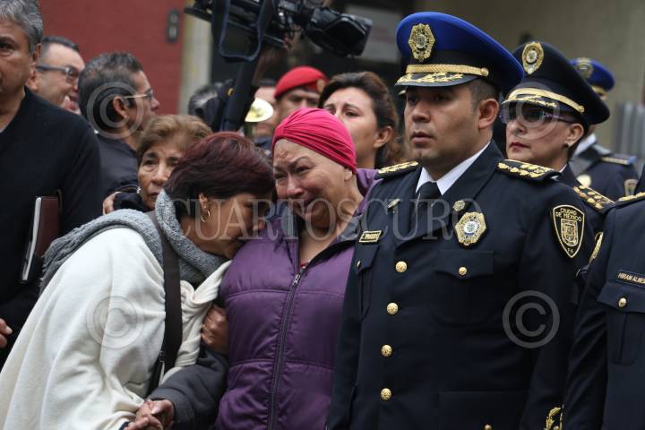 CIUDAD DE MÉXICO, 16DICIEMBRE2017.- Ceremonia de cuerpo presente de un policia auxiliar acaecido el día de ayer en el cumplimiento de su deber. Edgar Bautista, Hiram Almeida así como familiares acudieron a la despedida del policia, en la plaza Tlaxcoaque. FOTO: VICTORIA VALTIERRA /CUARTOSCURO.COM
