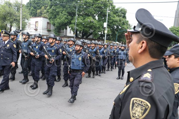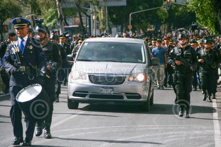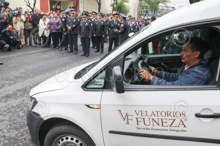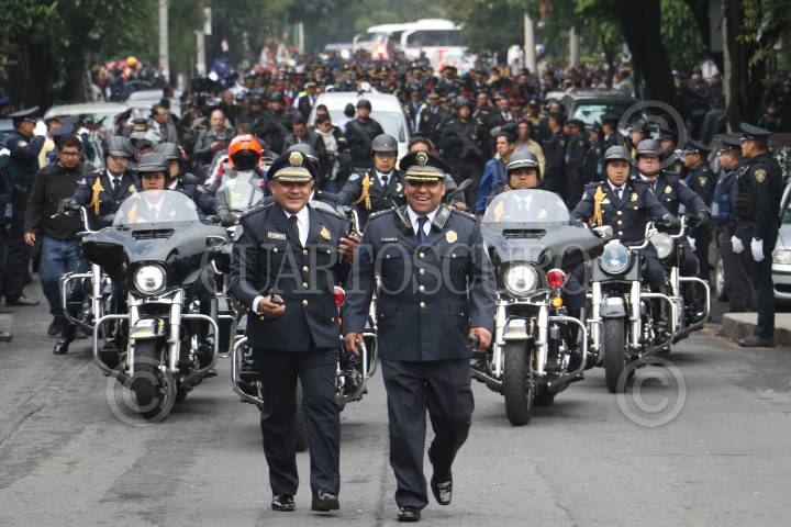 CIUDAD DE MÉXICO, 11JULIO2017.- Hiram Almeida, Secretario de Seguridad Pública de la Ciudad de México acompañados de mandos de la institución encabezaron la caravana luctosa donde se le rindió un homenaje al policia caído Pedro Reyes Magdaleno quien fue asesinado el día de ayer tras evitar un asalto a una sucursal de la CFE en la delegación Coyoacán. FOTO: SAÚL LÓPEZ /CUARTOSCURO.COM