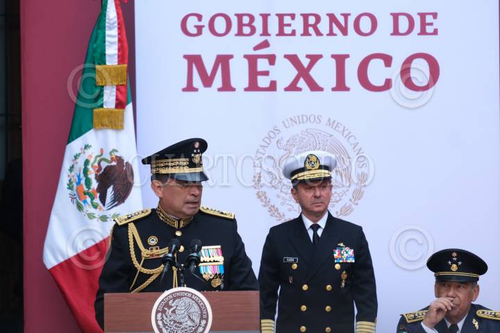 CIUDAD DE MÉXICO, 20NOVIEMBRE2019.- Luis Cresencio Sandoval Gutiérrez, secretario de Defensa Nacional, y José Rafael Ojeda Durán, secretario de Marina, durante su participación en la Ceremonia de Entrega de Condecoraciones y Ascensos a las Fuerzas Armadas, en el marco del 109 Aniversario de la Revolución Mexicana, el cual se realizó en el Patio central de Palacio Nacional. FOTO: GRACIELA LÓPEZ /CUARTOSCURO.COM