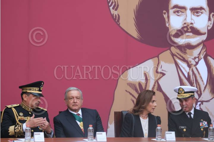 CIUDAD DE MÉXICO, 20NOVIEMBRE2019.- Luis Cresencio Sandoval Gutiérrez, secretario de Defensa Nacional; Andrés Manuel López Obrador, presidente de México; Beatriz Gutiérrez Müller, presidenta honoraria del Consejo Asesor de la Coordinación Nacional de Memoria Histórica y Cultural de México; José Rafael Ojeda Durán, secretario de Marina, conversaron durante la Ceremonia de Entrega de Condecoraciones y Ascensos a las Fuerzas Armadas, en el marco del 109 Aniversario de la Revolución Mexicana, el cual se realizó en el Patio central de Palacio Nacional. FOTO: GRACIELA LÓPEZ /CUARTOSCURO.COM