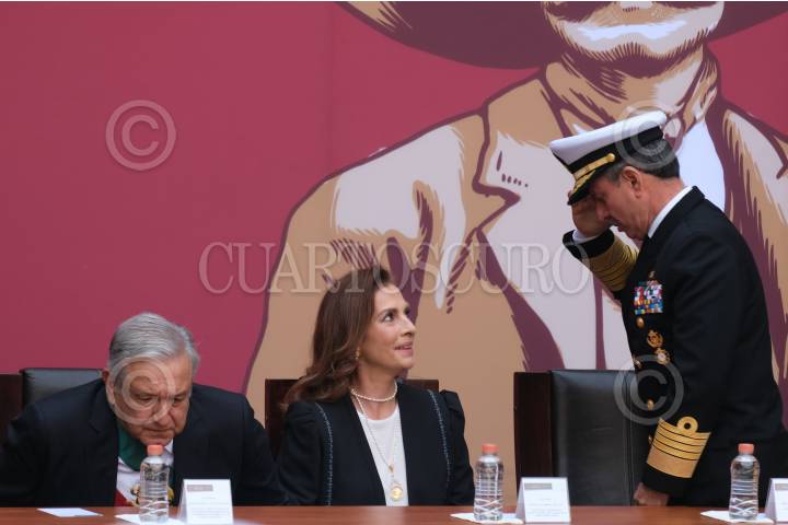 CIUDAD DE MÉXICO, 20NOVIEMBRE2019.- Andrés Manuel López Obrador, presidente de México, acompañado de su esposa Beatriz Gutiérrez Müller y José Rafael Ojeda Durán, secretario de Marina, durante la Ceremonia de Entrega de Condecoraciones y Ascensos a las Fuerzas Armadas, en el marco del 109 Aniversario de la Revolución Mexicana, el cual se realizó en el Patio central de Palacio Nacional. FOTO: GRACIELA LÓPEZ /CUARTOSCURO.COM