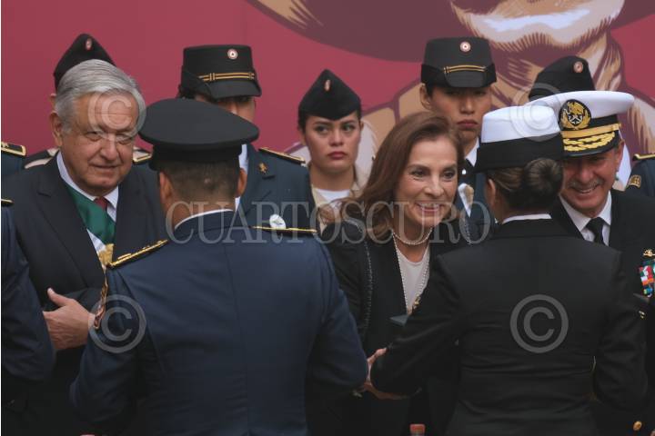 CIUDAD DE MÉXICO, 20NOVIEMBRE2019.- Andrés Manuel López Obrador, presidente de México, acompañado de su esposa Beatriz Gutiérrez Müller encabezaron la Ceremonia de Entrega de Condecoraciones y Ascensos a las Fuerzas Armadas, en el marco del 109 Aniversario de la Revolución Mexicana, la cual se realizó en el Patio central de Palacio Nacional. FOTO: GRACIELA LÓPEZ /CUARTOSCURO.COM