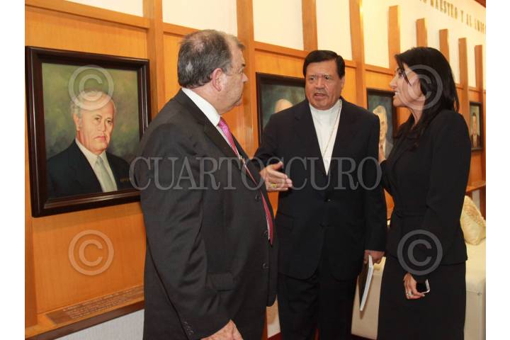 MÉXICO, D.F., 16AGOSTO2011.- Edgar Elías Azar, presidente del Tribunal Superior de Justicia del DF, Norberto Rivera, cardenal primado de México, y Alejandra Barrales, presidenta de la junta de gobierno de ALDF, en la presentación del Plan Integral de Manejo del Centro Histórico de la Ciudad de México 2011-2016, en el Palacio de Minería. FOTO: IVÁN MENDEZ/CUARTOSCURO.COM