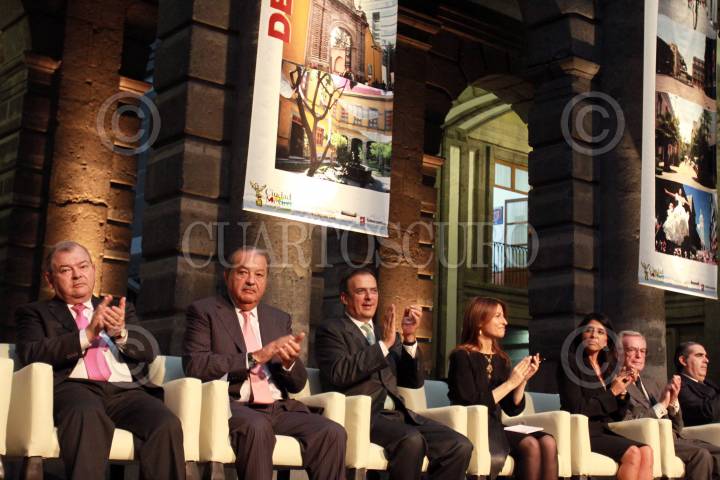 MÉXICO, D.F., 16AGOSTO2011.- Edgar Elías Azar, presidente del Tribunal Superior de Justicia del DF, Carlos Slim Helú, fundador del Grupo Carso, Marcelo Ebrard Casaubón, Jefe de Gobierno, Alejandra Barrales, presidenta del junta de gobierno de ALDF y Jacobo Zabludowsky, en la presentación del Plan Integral de Manejo del Centro Histórico de la Ciudad de México 2011-2016, en el Palacio de Minería. FOTO: IVÁN MENDEZ/CUARTOSCURO.COM