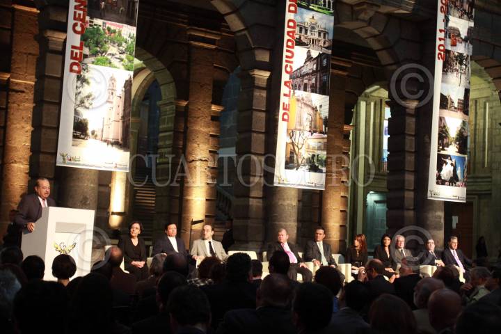 MÉXICO, D.F., 16AGOSTO2011.- Edgar Elías Azar, presidente del Tribunal Superior de Justicia del DF, Carlos Slim Helú, fundador del Grupo Carso, Marcelo Ebrard Casaubón, Jefe de Gobierno, Alenadra Barrales, presidenta del junta de gobierno de ALDF y Jacobo Zabludowsky, en la presentación del Plan Integral de Manejo del Centro Histórico de la Ciudad de México 2011-2016, en el Palacio de Minería. FOTO: IVÁN MENDEZ/CUARTOSCURO.COM