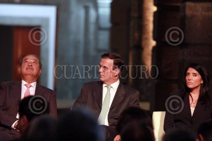 MÉXICO, D.F., 16AGOSTO2011.- Carlos Slim Helú, fundador del Grupo Carso, Marcelo Ebrard Casaubón, Jefe de Gobierno, y Alejandra Barrales, presidenta del junta de gobierno de ALDF, en la presentación del Plan Integral de Manejo del Centro Histórico de la Ciudad de México 2011-2016, en el Palacio de Minería. FOTO: IVÁN MENDEZ/CUARTOSCURO.COM