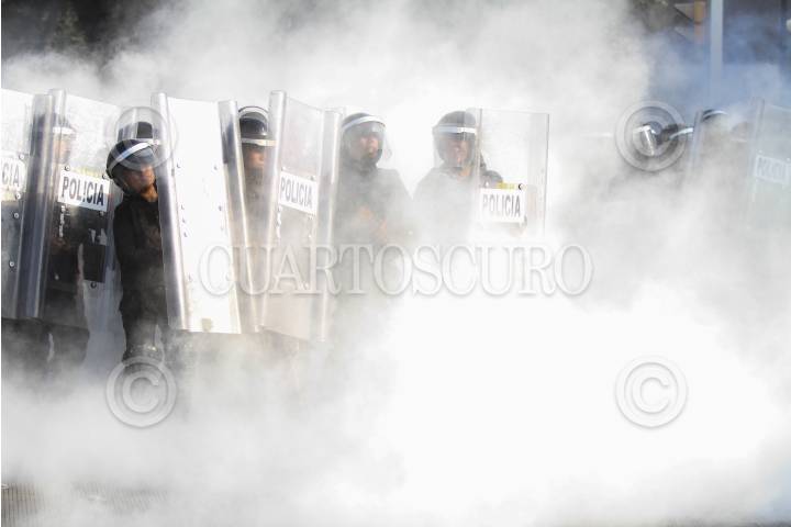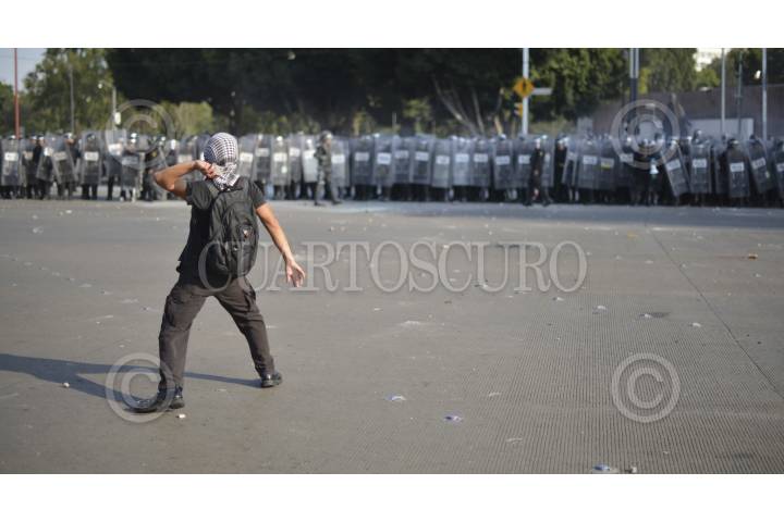 MÉXICO, D.F., 02OCTUBRE2013.- Enfrentamientos entre policías del Distrito Federal y jóvenes que se manifestaban durante la marcha en conmemoración del 02 de octubre de 1968. En la esquina de Eje Central y Av. Hidalgo se dio el primer enfrentamiento y continuo hasta la Glorieta de Colón. FOTO: ADOLFO VLADIMIR /CUARTOSCURO.COM