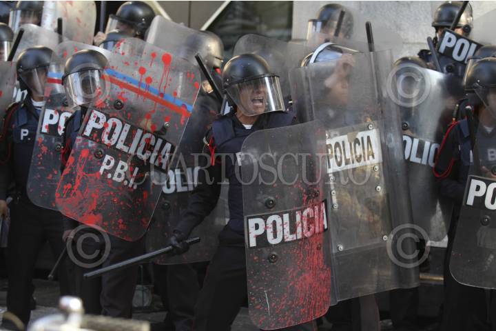 MÉXICO, D.F., 02OCTUBRE2013.- Maestros de la Coordinadora Nacional de Trabajadores de la Educación realizaron una valla para impedir la entrada de los granaderos del Distrito Federal, quienes pretendían replegarlos. Esto, durante los enfrentamientos en la marcha por el aniversario del 02 de octubre de 1968. FOTO: ADOLFO VLADIMIR /CUARTOSCURO.COM