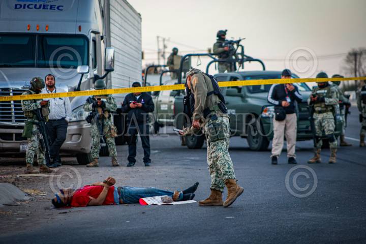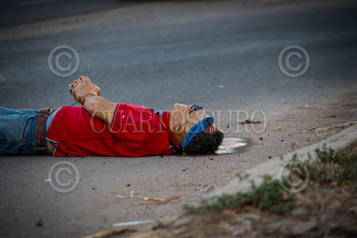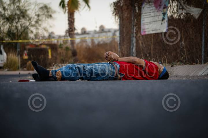 Unos vecinos de la calle Avicultura en la colonia Independencia, pasan frente al cadáver de un hombre que fue dejado por sus homicidas durante la madrugada.