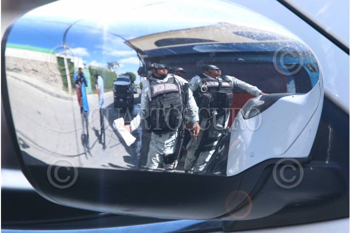 CUERNAVACA, MORELOS, 09SEPTIEMBRE2023.- El cadáver de un hombre con las manos y pies atados, con el rostro cubierto con vendas y señales de tortura y varios balazos fue localizado en la calle Bernal Diaz de Castillo en la colonia Lomas de Cortes, al norte de la capital. El hallazgo fue reportado por vecinos a la policía de Morelos quienes junto con elementos de la Guardia Nacional acordonaron el sitio en espera de investigadores de la Fiscalía de Justicia quienes recogieron evidencias para la averiguación que inicia. Finalmente, el cadáver fue levantado por trabajadores del Servicio Médico Forense y llevado a la morgue donde se espera que sea reconocido y reclamado. En la imagen elementos de la Guardia Nacional se reflejan en un espejo de una patrulla. FOTO: MARGARITO PÉREZ RETANA / CUARTOSCURO.COM