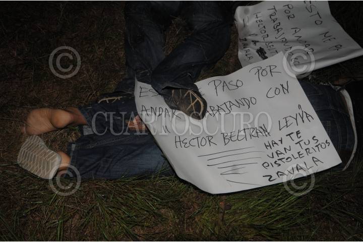 ACAPULCO, GUERRERO, 27AGOSTO2010.- Cuatro cuerpos fueron hallados con una cartulina blanca con un mensaje escrito en tinta negra, -Esto me pasó por andar trabajando con "Héctor Beltrán Leyva", esto en el kilómetro 7+900, a unos 200 metros de la caseta de peaje en un poblado llamado Metlalpil. La zona fue asegurada por personal de la Policía Federal y estatal quienes se apostaron sobre la carretera. FOTO: BERNANDINO HERNÁNDEZ/CUARTOSCURO.COM