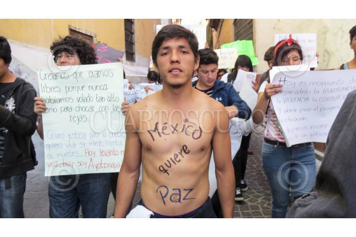 GUANAJUATO, GUANAJUATO, 01DICIEMBRE2014. ¡Vivos de los llevaron, vivos los queremos!" y "¡Fuera Peña Nieto, fuera Peña Nieto", volvieron a ser las consignas más fuertes durante la marcha en la capital de Guanajuato por los 43 normalistas desaparecidos de Ayotzinapa. FOTO: GERARDO M. GARCÍA /CUARTOSCURO.COM