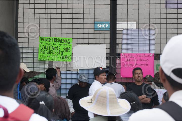 MÉXICO, D.F., 15ENERO2013.- Cientos de personas pertenecientes a los pueblos indígenas del valle del Mezquital en Ixmiquilpan, Hidalgo, realizaron una manifestación afuera de la sede de la Secretaría de Hacienda y Crédito Público ubicada sobre avenida Constituyentes, exigiendo a las autoridades el presupuesto económico 2013 para las obras públicas de su municipio que manifestaron, les despojaron algunos diputados de Hidalgo pertenecientes al PRI. FOTO: DIEGO SIMÓN SÁNCHEZ / CUARTOSCURO.COM