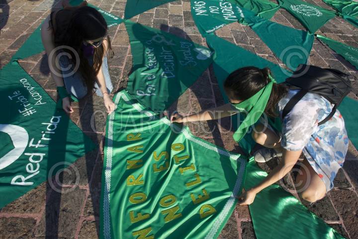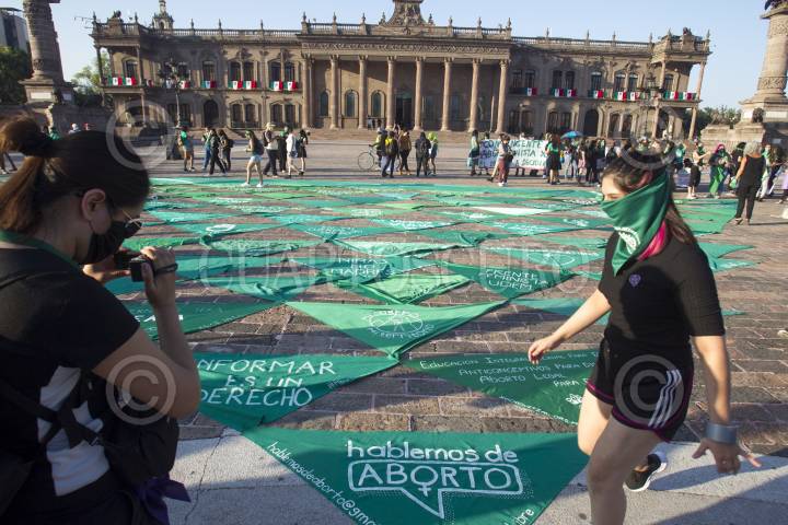 MONTERREY, NUEVO LEÓN, 27SEPTIEMBRE2020.- Mujeres del colectivo “Hablemos de Aborto” y feministas en Nuevo León, organizaron una manifestación en la Explanada de los Héroes, donde expusieron un Mega pañuelo por el derecho a decidir con palabras a favor del aborto libre. FOTO: GABRIELA PÉREZ MONTIEL /CUARTOSCURO.COM