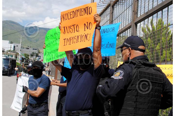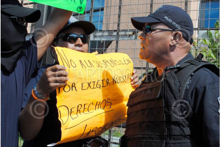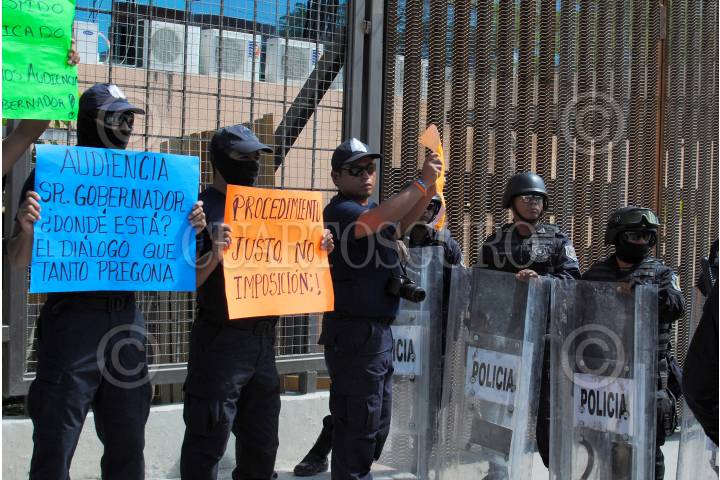 CHILPANCINGO, GUERRERO, 05AGOSTO2015.- Policías acreditables del estado que hoy cumplen 17 días en paro de labores y en plantón frente a la entrada principal del palacio de gobierno para exigir su derechos y reclamar su suspensión por parte del ejecutivo del estado por exigir derechos laborales. Policías del estado intentaron replegarlos de la acotación de las estaciones del palacio a pesar de que ningún momento bloquearon las entradas, solo exigían audiencia con el gobernador del estado Rogelio Salvador Ortega Martínez. FOTO: JOSÉ I. HERNÁNDEZ /CUARTOSCURO.COM