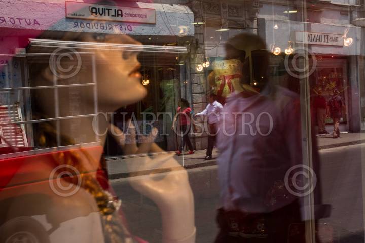 MEXICO, D.F., 18ABRIL2015.- Con mirada altiva, un maniquí pareciera observar desde la vitrina a los transeuntes que caminan distraídos por la acera. Tienda de vestidos en la calle de República de Argentina, en el centro histórico de la ciudad. FOTO: DAVID POLO /CUARTOSCURO.COM